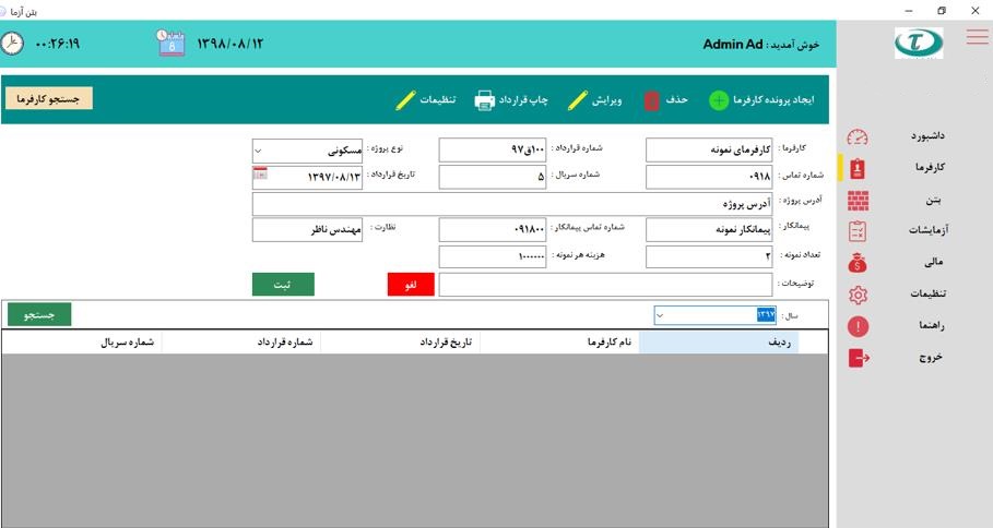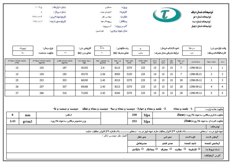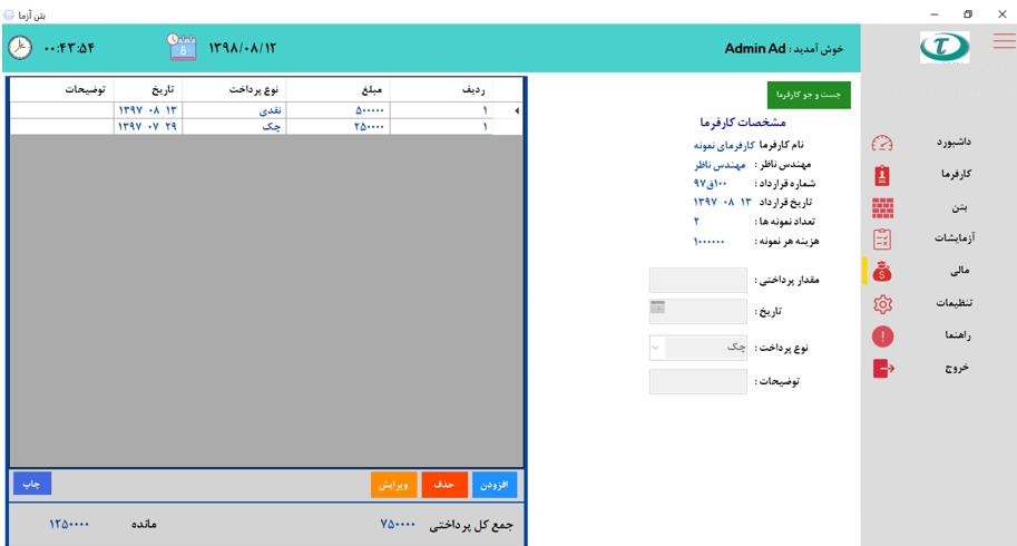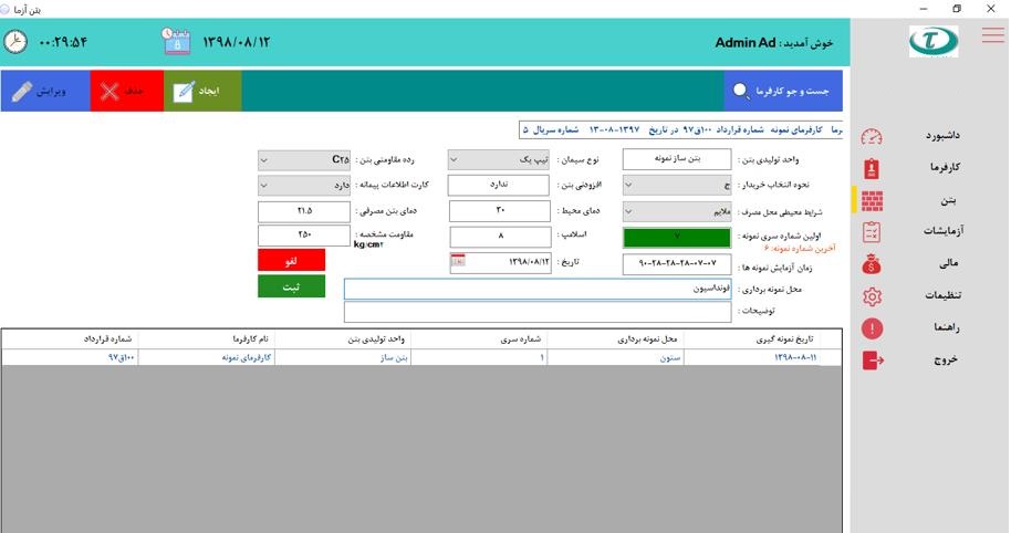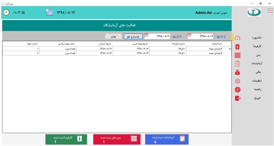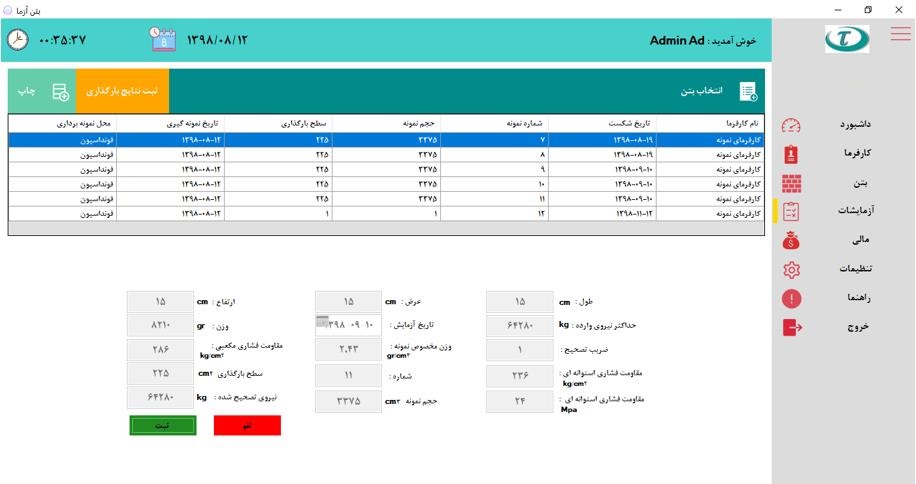 Beton Azma نرم افزار مدیریت آزمایشگاه بتن (بتن آزما) Beton Azma ثبت مشخصات و اطلاعات آزمایشگاهامکان تعریف نامحدود کاربرامکان تعریف سطح دسترسی هر کاربرثبت اطلاعات پروژه شامل کارفرما ، نظارت ، پیمانکار ثبت اطلاعات نمونه های بتنییادآور شکست روزانه نمونه های بتنثبت اطلاعات بارگذاری نمونه هاانجام کلیه محاسبات نمونه هامحاسبات مقاومت فشاری مکعبی و استوانه ایمدیریت وضعیت مالی مشتریان(بدهی – جزییات پرداختها – چاپ فاکتور)چاپ قراردادچاپ گزارش مقاومت فشاری بتن مطابق استاندارد 6044امکان جستجو در تمامی فرم های نرم افزارامکان پشتیبان گیری و بازیابی فایل پشتیبانکنترل فعالیت کاربران در محیط نرم افزار یادآور شکست روزانه نمونه های بتن ثبت اطلاعات پروژه شامل کارفرما ، نظارت ، پیمانکار و …. ثبت اطلاعات نمونه های بتنی ثبت اطلاعات بارگذاری نمونه هاانجام کلیه محاسبات نمونه هامحاسبات مقاومت فشاری مکعبی و استوانه ای چاپ گزارش مقاومت فشاری بتن مطابق استاندارداطلاعات پروژه شامل کارفرما ، نظارت ، پیمانکاراطلاعات بارگذاری نمونه هااطلاعات نمونه های بتنی امکان جستجو در تمامی فرم های نرم افزارامکان پشتیبان گیری و بازیابی فایل پشتیبانکنترل فعالیت کاربران در محیط نرم افزار ثبت اطلاعات مالی هر پروژهچاپ رسید و فاکتور مالی